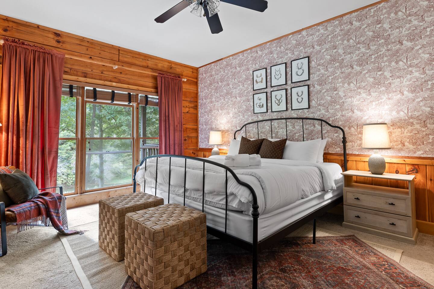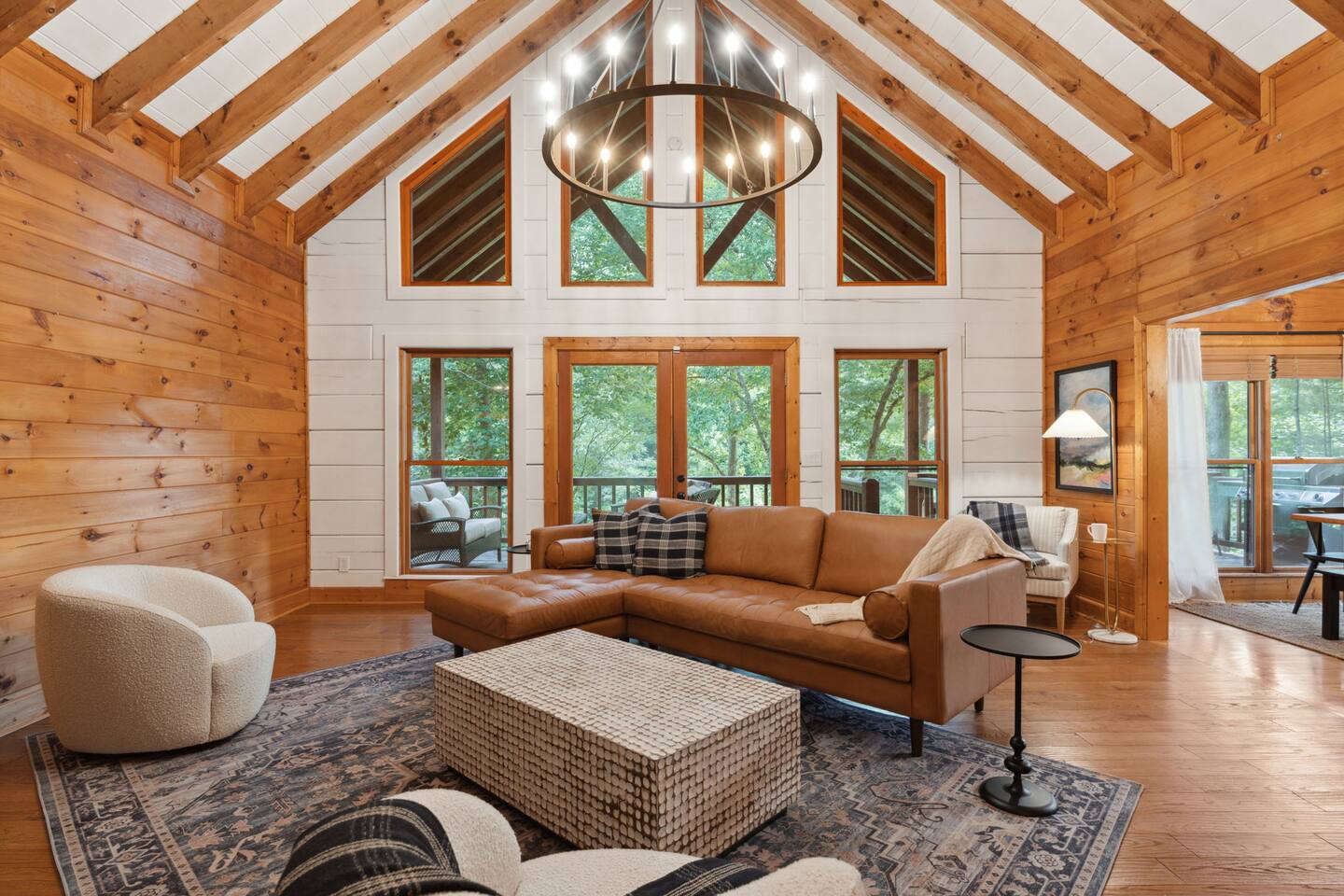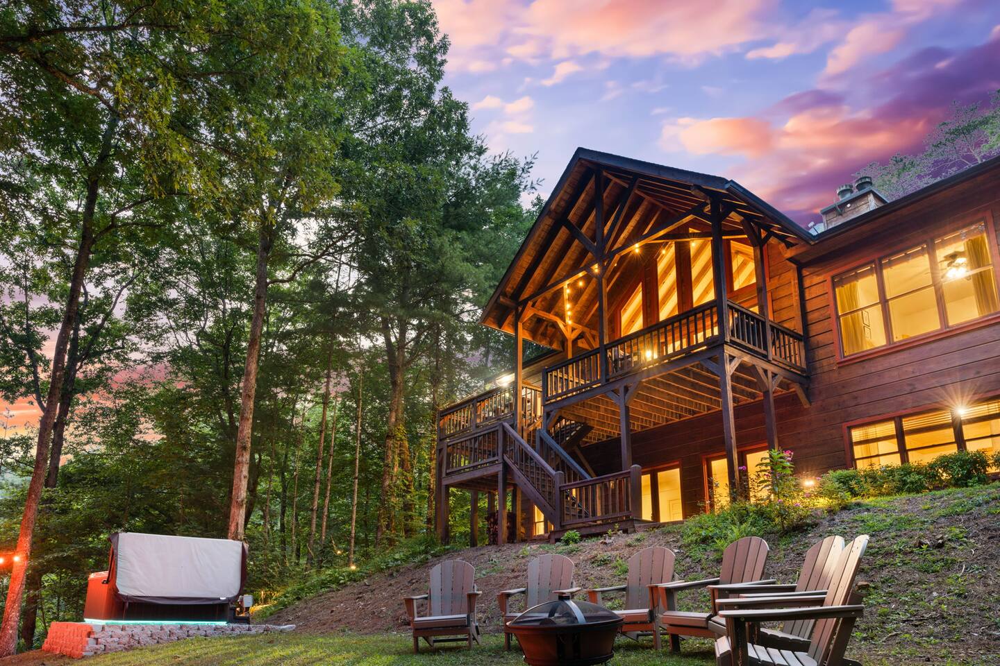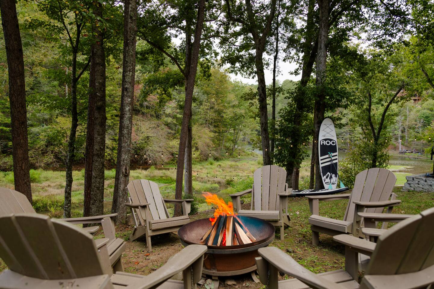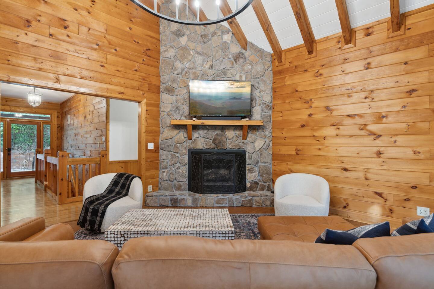 🌲 Welcome to THE HIDDEN STILL — Blue Ridge Speakeasy Lakehouse. Waterfront on serene Allen Lake with mountain views and just 13 minutes to Downtown Blue Ridge. Renovated, and designed for groups to spread out, reconnect, and make memories. 🍂 WEDDINGS & EVENTS WELCOME - Please inquire first. 🛋 The Space: 🛏 7 bedrooms • 4.5 baths • sleeps 22 (including queen pullout on the lower level) 🏡 Main level (upstairs): Four bedrooms — 3 King suites (each with walk‑in closet) and 1 Queen rooms (with walk‑in closet). Open great room with Smart TV, and lake views, dining for a crowd, and a fully stocked chef’s kitchen. 🧭 Lower level: Three Bedrooms (two Twins, 1 King, plus a Bunk room with 4x Queen Bunks). A second living room with Smart TV and the queen pullout, plus walk‑out patio access. 🕵️♂️ Hidden speakeasy: Concealed behind a bookshelf door — moody lounge lighting, conversation seating, bar‑ready vibe (BYO). Signature photo moment. 🎬 Home theater: Big‑screen movie area for film nights and the big game. 🌅 Outdoors 🎣 Private dock on Allen Lake — quiet mornings & golden‑hour sunsets 🪵 Two decks + patio, 🔥 wood‑burning fire pit with Adirondack seating, ✨ bistro lights in the trees 🛁 7‑person hot tub with LED lights 🌊 On‑the‑Water & 🥾 Nearby 🛶 2 paddleboards + kayaks 🛟 life jackets included 🎣 Fishing off the dock; peaceful, non‑motorized lake setting 🚗 Minutes to Blue Ridge eats & breweries, Mercier Orchards, the Aska Trail system, waterfalls, and white‑water rafting on the Ocoee/Toccoa 🎮 Entertainment & Amenities 📺 55" Smart TVs in great room, primary bedroom, and lower living room 🎵 Record player + starter records (bring favorites!) 🎯 Games: shuffleboard, darts, mini hoops, cornhole, chess, and classic board games 📶 Fast Wi‑Fi and cozy nooks to read or work 🍽️ Kitchen & Dining 🍳 Fully equipped kitchen with quality cookware, bakeware, knives, and prep tools ☕ Nespresso + drip coffee maker; blender & essentials for group meals 🍽️ Indoor dining table + alfresco dining on the deck 👶 Family‑Friendly 🧒 High chair and Pack ’n Play provided 🔔 Door chimes on every exterior door for added peace of mind 🐶 Pet Policy 🐾 Up to 2 dogs welcome; $125 per stay 🧺 Please ensure pups are crate‑trained and tidy up after them 🔑 Guest Access 🔓 Entire home is yours (except a locked owner’s closet ) 🔢 Smart keypad entry with unique code 🚗 Parking & Getting Here 🅿️ Ample driveway parking; SUV is required for neighborhood approach (gravel driveway) 📌 Things to Know ⏰ Check‑in 4:00 PM • Check‑out 10:00 AM 🧾 Primary guest 21+ and staying each night 🎉 No parties and 🚭 no smoking/vaping of any kind There is a $500 fine for smoking inside 👥 Only registered guests overnight 📷 Exterior security cameras: driveway, cameras do not face any private interior spaces Whether you’re chasing a peaceful lakeside escape or a Blue Ridge adventure, The Hidden Still serves room to relax, spaces to play, and a one‑of‑a‑kind speakeasy your group will never forget. ✨