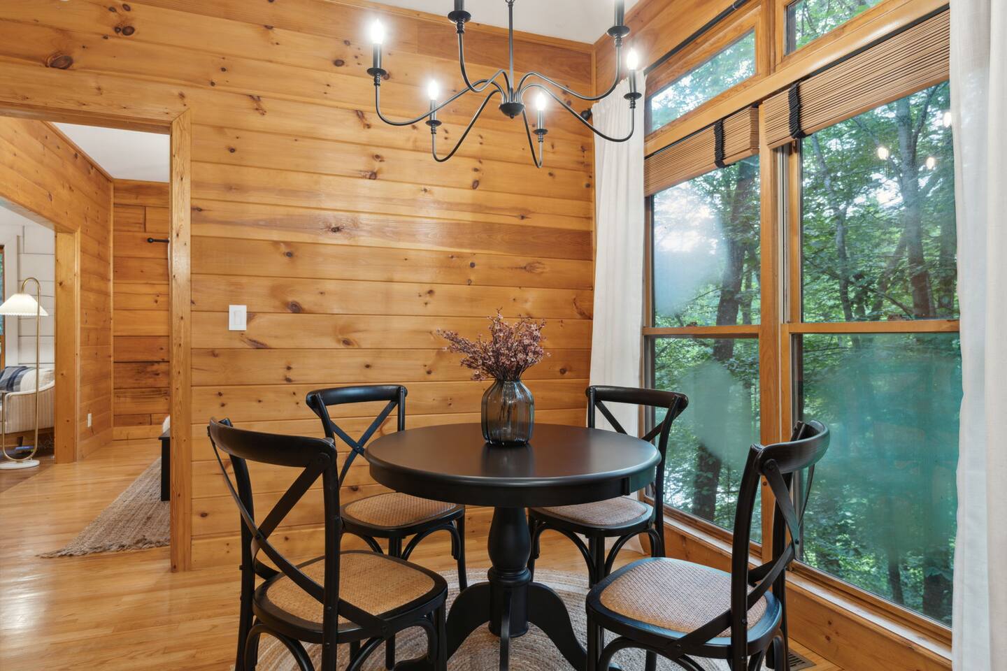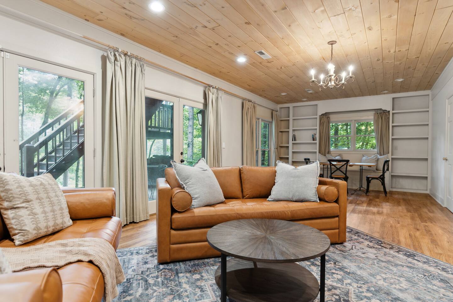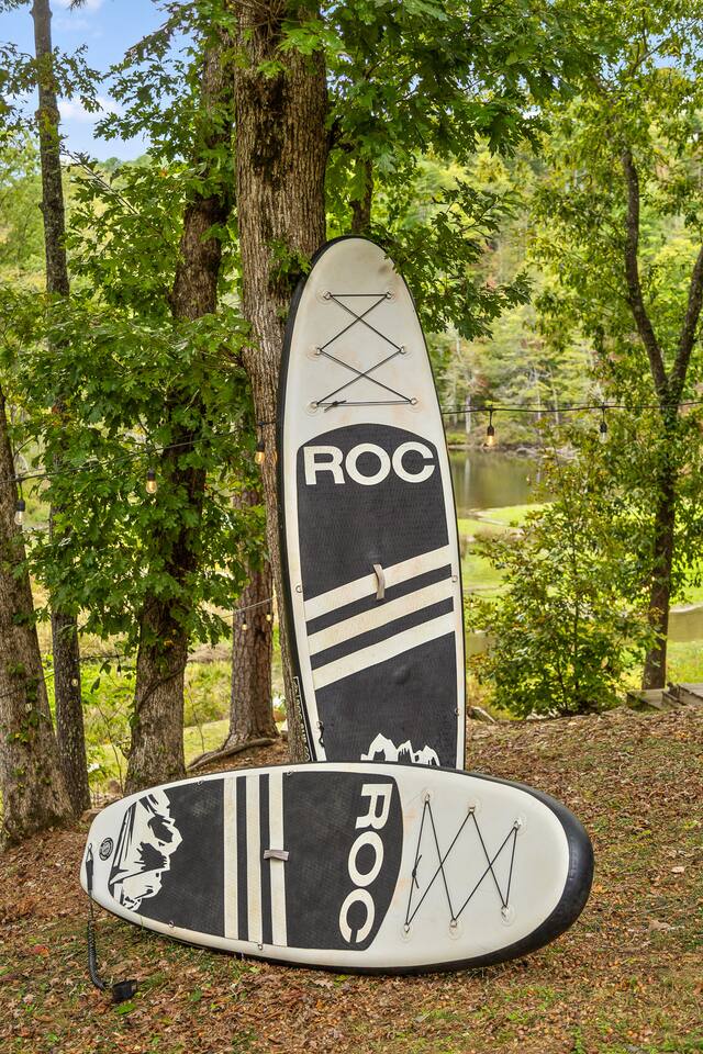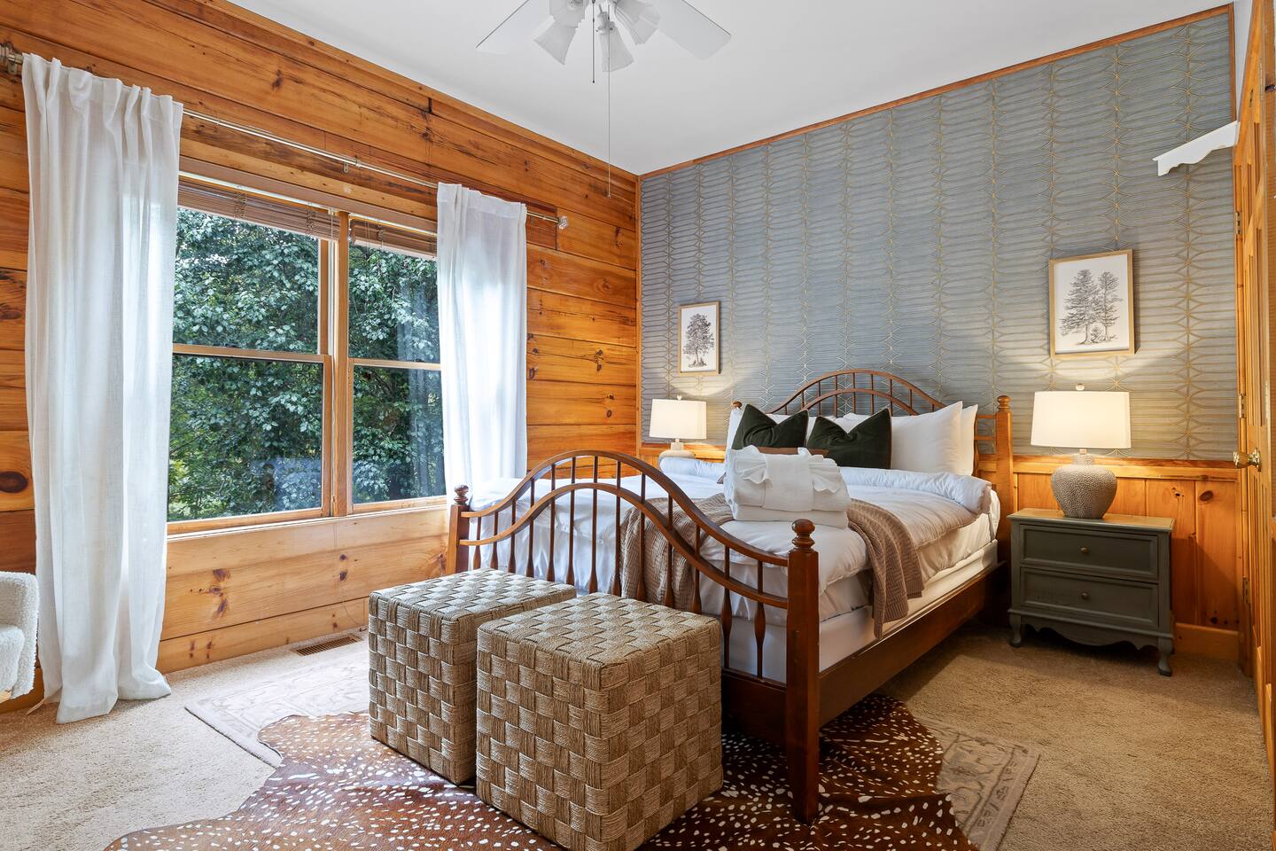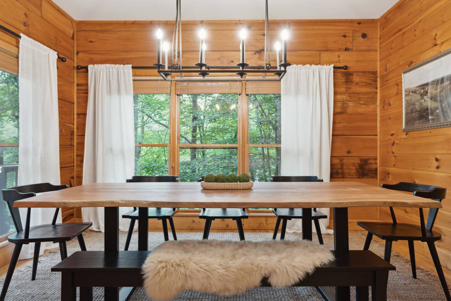 🌲 Welcome to THE HIDDEN STILL — Blue Ridge Speakeasy Lakehouse. Waterfront on serene Allen Lake with mountain views and just 13 minutes to Downtown Blue Ridge. Renovated, and designed for groups to spread out, reconnect, and make memories. 🍂 WEDDINGS & EVENTS WELCOME - Please inquire first. 🛋 The Space: 🛏 7 bedrooms • 4.5 baths • sleeps 22 (including queen pullout on the lower level) 🏡 Main level (upstairs): Four bedrooms — 3 King suites (each with walk‑in closet) and 1 Queen rooms (with walk‑in closet). Open great room with Smart TV, and lake views, dining for a crowd, and a fully stocked chef’s kitchen. 🧭 Lower level: Three Bedrooms (two Twins, 1 King, plus a Bunk room with 4x Queen Bunks). A second living room with Smart TV and the queen pullout, plus walk‑out patio access. 🕵️♂️ Hidden speakeasy: Concealed behind a bookshelf door — moody lounge lighting, conversation seating, bar‑ready vibe (BYO). Signature photo moment. 🎬 Home theater: Big‑screen movie area for film nights and the big game. 🌅 Outdoors 🎣 Private dock on Allen Lake — quiet mornings & golden‑hour sunsets 🪵 Two decks + patio, 🔥 wood‑burning fire pit with Adirondack seating, ✨ bistro lights in the trees 🛁 7‑person hot tub with LED lights 🌊 On‑the‑Water & 🥾 Nearby 🛶 2 paddleboards + kayaks 🛟 life jackets included 🎣 Fishing off the dock; peaceful, non‑motorized lake setting 🚗 Minutes to Blue Ridge eats & breweries, Mercier Orchards, the Aska Trail system, waterfalls, and white‑water rafting on the Ocoee/Toccoa 🎮 Entertainment & Amenities 📺 55" Smart TVs in great room, primary bedroom, and lower living room 🎵 Record player + starter records (bring favorites!) 🎯 Games: shuffleboard, darts, mini hoops, cornhole, chess, and classic board games 📶 Fast Wi‑Fi and cozy nooks to read or work 🍽️ Kitchen & Dining 🍳 Fully equipped kitchen with quality cookware, bakeware, knives, and prep tools ☕ Nespresso + drip coffee maker; blender & essentials for group meals 🍽️ Indoor dining table + alfresco dining on the deck 👶 Family‑Friendly 🧒 High chair and Pack ’n Play provided 🔔 Door chimes on every exterior door for added peace of mind 🐶 Pet Policy 🐾 Up to 2 dogs welcome; $125 per stay 🧺 Please ensure pups are crate‑trained and tidy up after them 🔑 Guest Access 🔓 Entire home is yours (except a locked owner’s closet ) 🔢 Smart keypad entry with unique code 🚗 Parking & Getting Here 🅿️ Ample driveway parking; SUV is required for neighborhood approach (gravel driveway) 📌 Things to Know ⏰ Check‑in 4:00 PM • Check‑out 10:00 AM 🧾 Primary guest 21+ and staying each night 🎉 No parties and 🚭 no smoking/vaping of any kind There is a $500 fine for smoking inside 👥 Only registered guests overnight 📷 Exterior security cameras: driveway, cameras do not face any private interior spaces Whether you’re chasing a peaceful lakeside escape or a Blue Ridge adventure, The Hidden Still serves room to relax, spaces to play, and a one‑of‑a‑kind speakeasy your group will never forget. ✨
