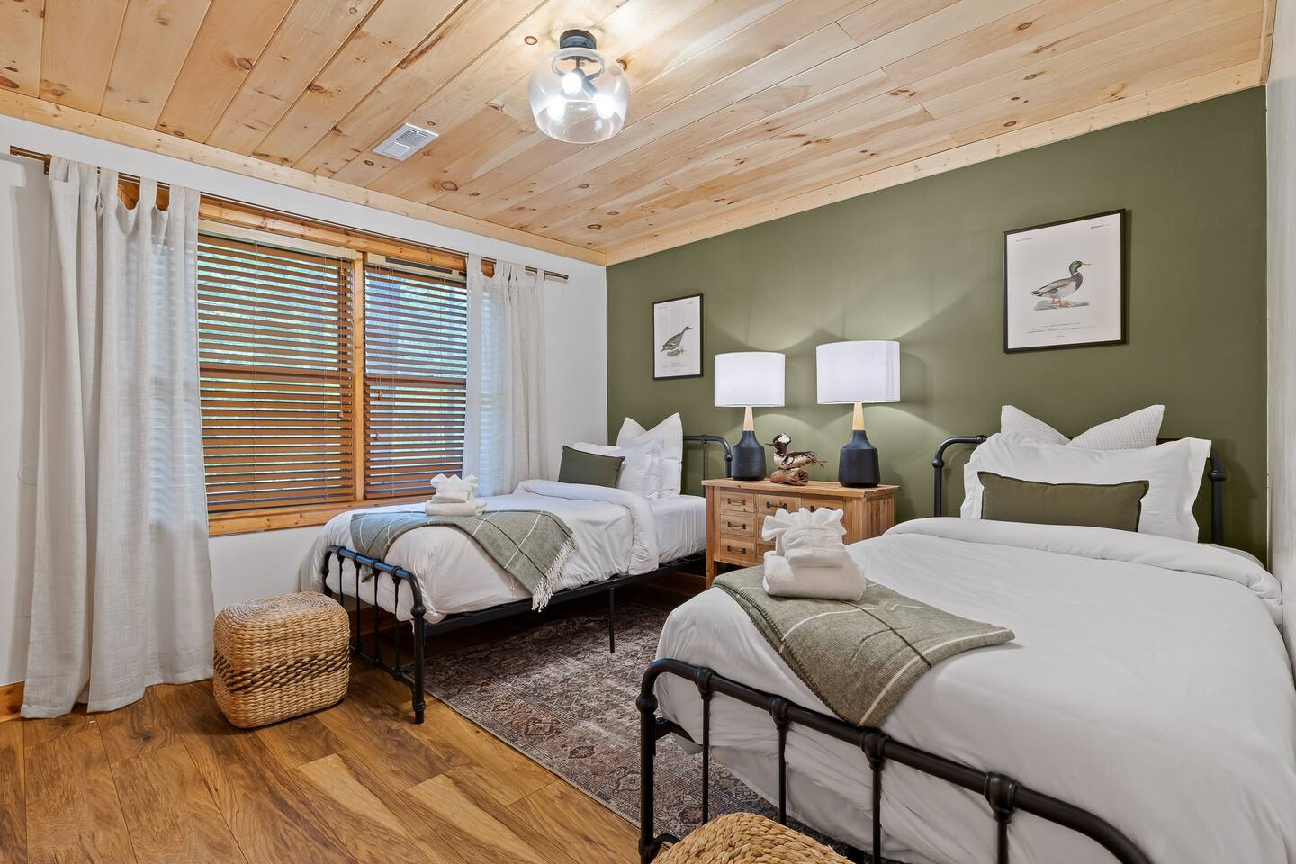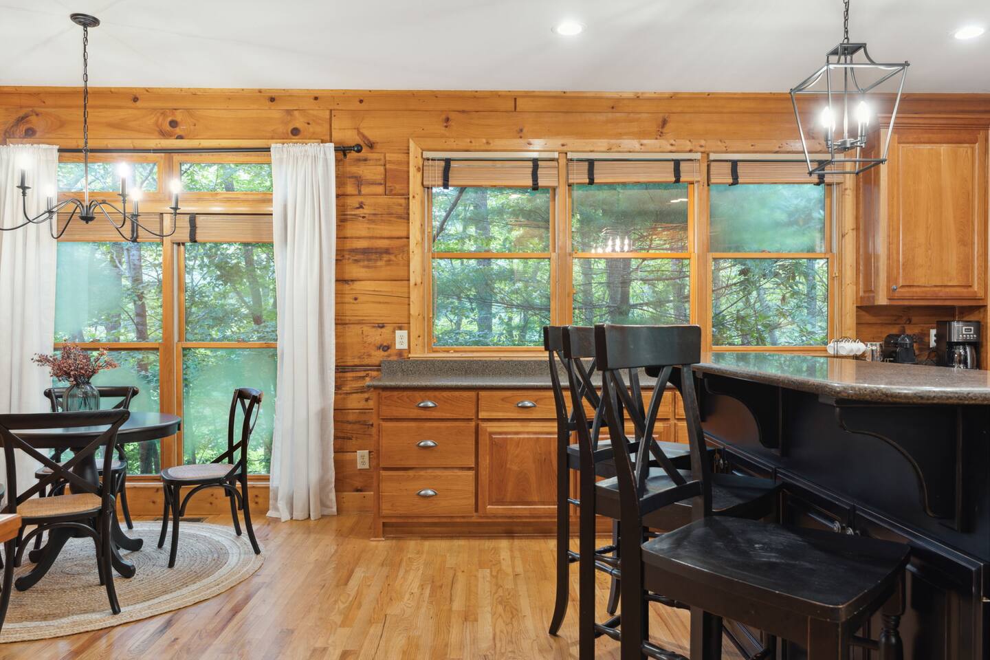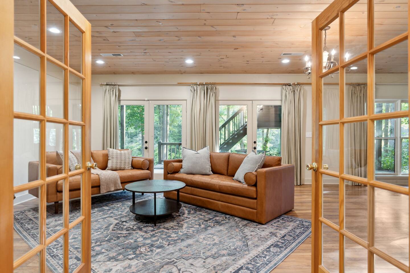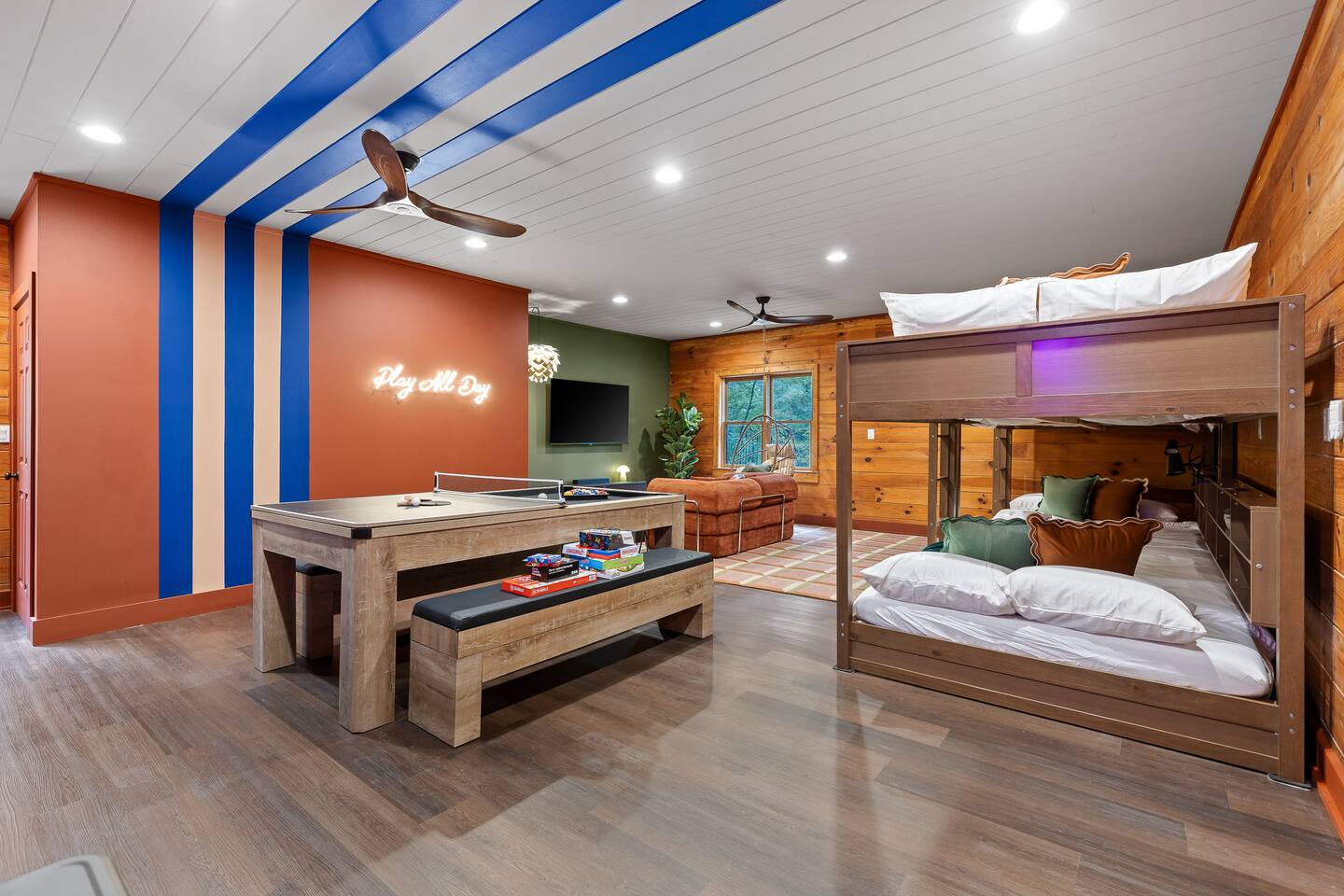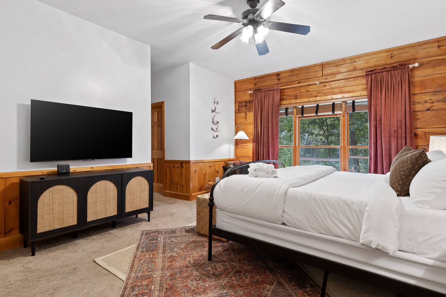 🌲 Welcome to THE HIDDEN STILL — Blue Ridge Speakeasy Lakehouse. Waterfront on serene Allen Lake with mountain views and just 13 minutes to Downtown Blue Ridge. Renovated, and designed for groups to spread out, reconnect, and make memories. 🍂 WEDDINGS & EVENTS WELCOME - Please inquire first. 🛋 The Space: 🛏 7 bedrooms • 4.5 baths • sleeps 22 (including queen pullout on the lower level) 🏡 Main level (upstairs): Four bedrooms — 3 King suites (each with walk‑in closet) and 1 Queen rooms (with walk‑in closet). Open great room with Smart TV, and lake views, dining for a crowd, and a fully stocked chef’s kitchen. 🧭 Lower level: Three Bedrooms (two Twins, 1 King, plus a Bunk room with 4x Queen Bunks). A second living room with Smart TV and the queen pullout, plus walk‑out patio access. 🕵️♂️ Hidden speakeasy: Concealed behind a bookshelf door — moody lounge lighting, conversation seating, bar‑ready vibe (BYO). Signature photo moment. 🎬 Home theater: Big‑screen movie area for film nights and the big game. 🌅 Outdoors 🎣 Private dock on Allen Lake — quiet mornings & golden‑hour sunsets 🪵 Two decks + patio, 🔥 wood‑burning fire pit with Adirondack seating, ✨ bistro lights in the trees 🛁 7‑person hot tub with LED lights 🌊 On‑the‑Water & 🥾 Nearby 🛶 2 paddleboards + kayaks 🛟 life jackets included 🎣 Fishing off the dock; peaceful, non‑motorized lake setting 🚗 Minutes to Blue Ridge eats & breweries, Mercier Orchards, the Aska Trail system, waterfalls, and white‑water rafting on the Ocoee/Toccoa 🎮 Entertainment & Amenities 📺 55" Smart TVs in great room, primary bedroom, and lower living room 🎵 Record player + starter records (bring favorites!) 🎯 Games: shuffleboard, darts, mini hoops, cornhole, chess, and classic board games 📶 Fast Wi‑Fi and cozy nooks to read or work 🍽️ Kitchen & Dining 🍳 Fully equipped kitchen with quality cookware, bakeware, knives, and prep tools ☕ Nespresso + drip coffee maker; blender & essentials for group meals 🍽️ Indoor dining table + alfresco dining on the deck 👶 Family‑Friendly 🧒 High chair and Pack ’n Play provided 🔔 Door chimes on every exterior door for added peace of mind 🐶 Pet Policy 🐾 Up to 2 dogs welcome; $125 per stay 🧺 Please ensure pups are crate‑trained and tidy up after them 🔑 Guest Access 🔓 Entire home is yours (except a locked owner’s closet ) 🔢 Smart keypad entry with unique code 🚗 Parking & Getting Here 🅿️ Ample driveway parking; SUV is required for neighborhood approach (gravel driveway) 📌 Things to Know ⏰ Check‑in 4:00 PM • Check‑out 10:00 AM 🧾 Primary guest 21+ and staying each night 🎉 No parties and 🚭 no smoking/vaping of any kind There is a $500 fine for smoking inside 👥 Only registered guests overnight 📷 Exterior security cameras: driveway, cameras do not face any private interior spaces Whether you’re chasing a peaceful lakeside escape or a Blue Ridge adventure, The Hidden Still serves room to relax, spaces to play, and a one‑of‑a‑kind speakeasy your group will never forget. ✨